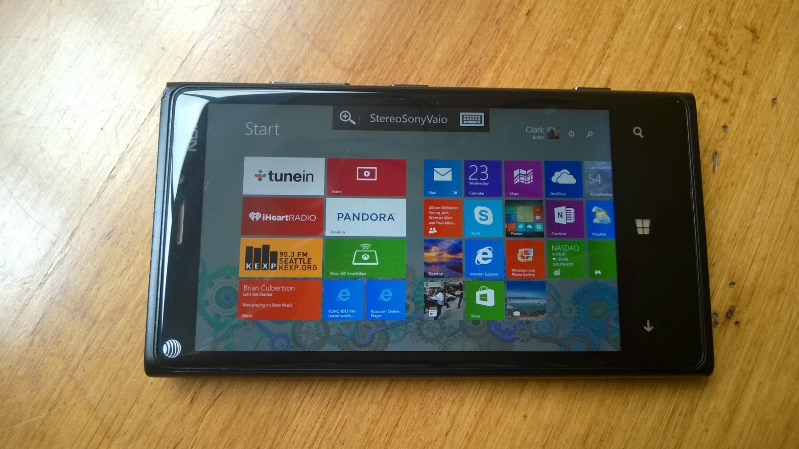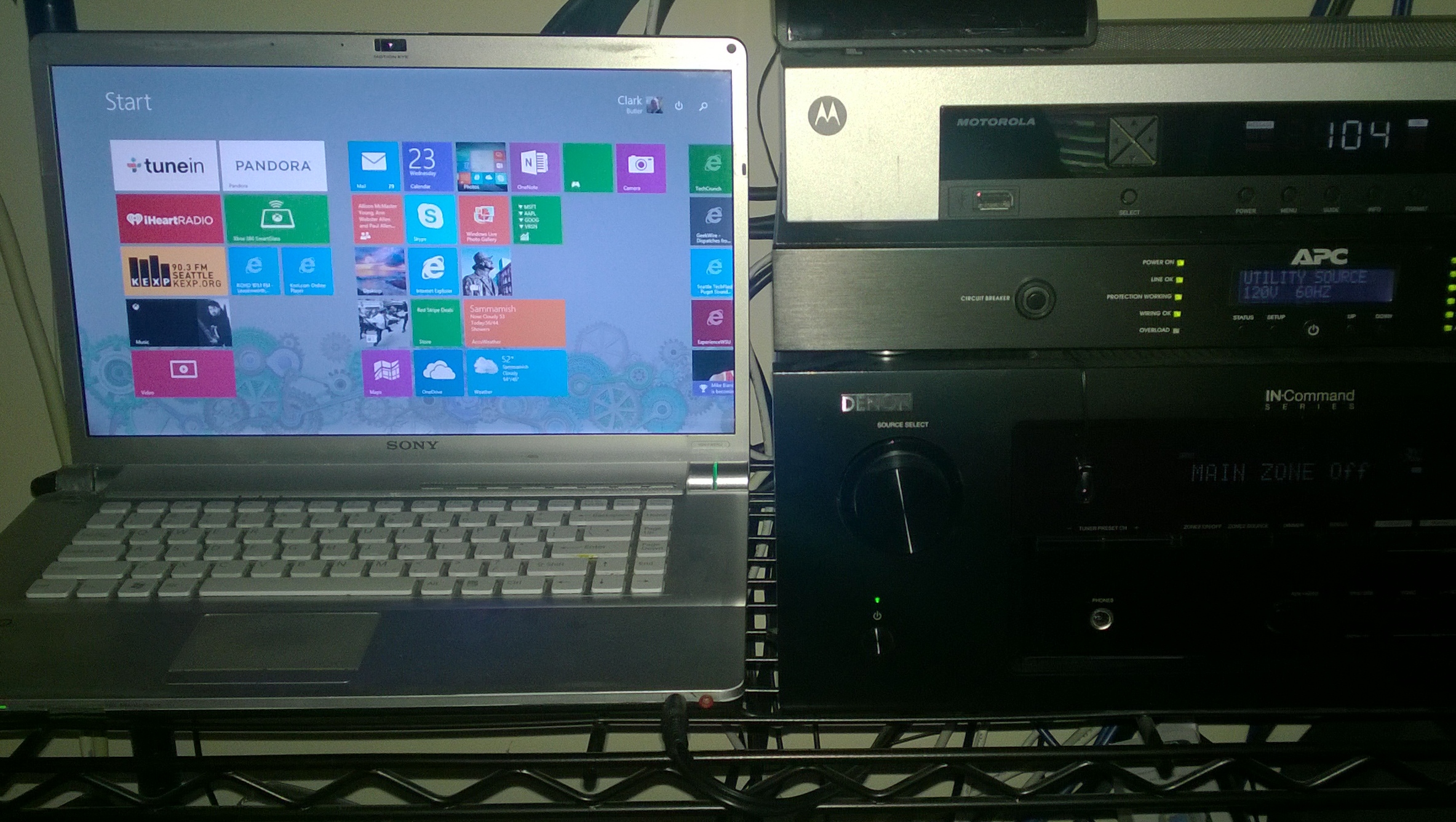 Here’s the 6 yr old Sony Vaio laptop, running Windows 8.1, that’s hooked into our stereo in the closet in my home office, with live tiles for all of our music apps and music sources (note the gray/purple desktop background):