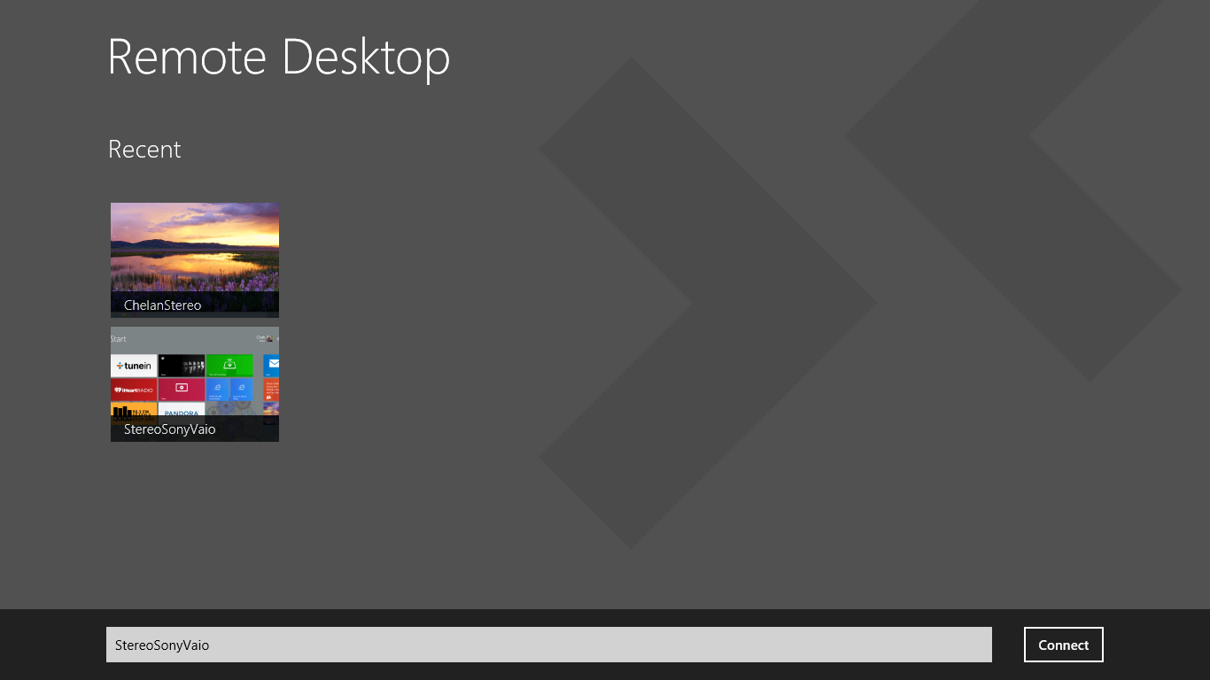 But what if I’m not at my desk, let’s say I’m sitting on the couch, or upstairs in our bedroom, or out on the back patio, using my Surface? The Windows 8 Remote Desktop app let’s me connect to and control our Stereo laptop using either keyboard or touch from my Surface, or any other touch enabled Windows 8 device.